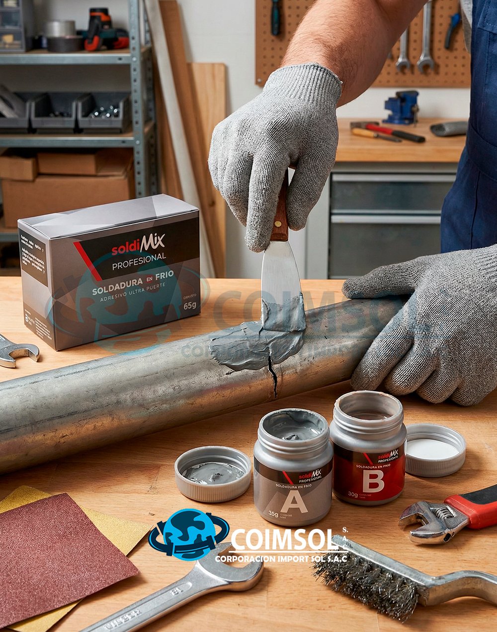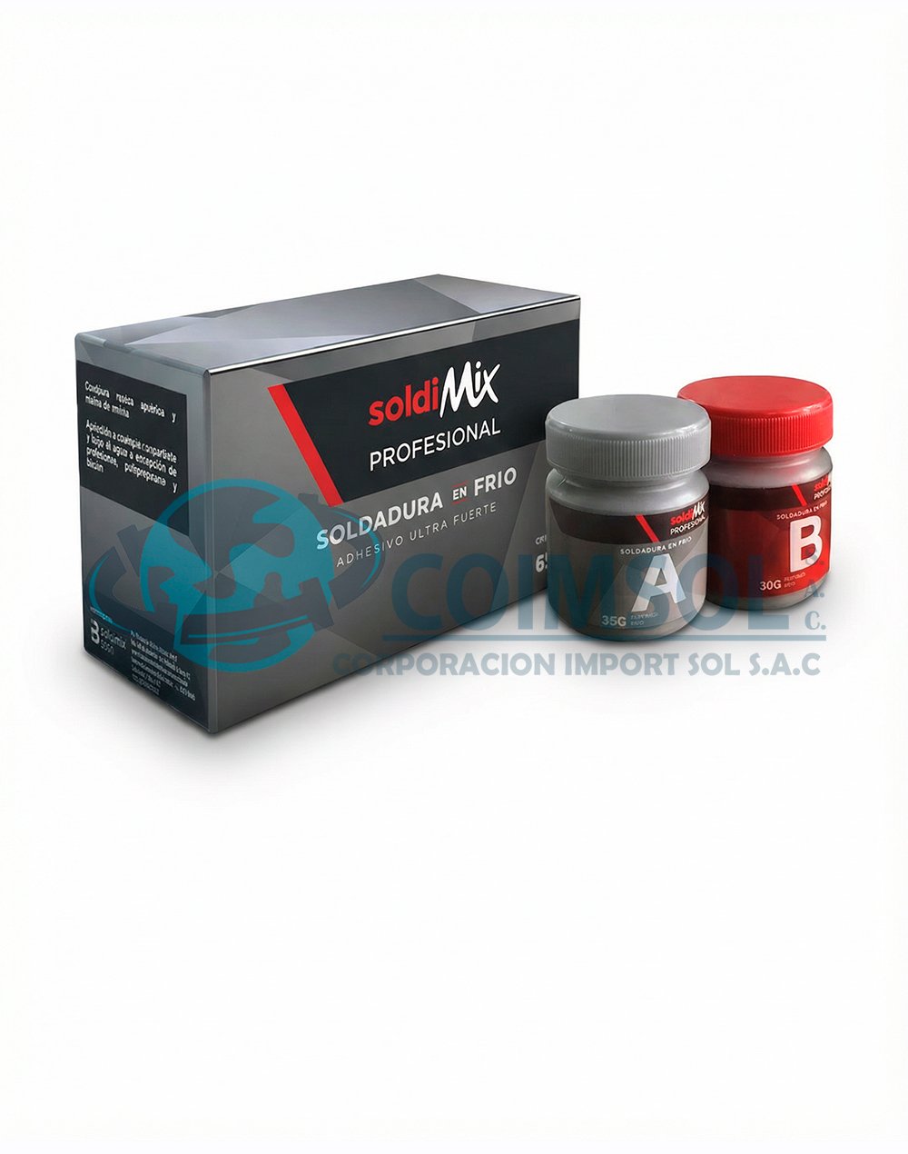 Soldadura en frío Soldimix Ultra Fuerte de 65 g, adhesivo epóxico bicomponente de grado industrial ideal para reparar, sellar y unir metales, concreto, vidrio, cerámica, madera y caucho. Ofrece alta resistencia mecánica, buena resistencia química y excelente desempeño en trabajos de mantenimiento y reparación.