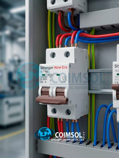 Llave termomagnética bipolar Stronger New Era de 2 x 16A, diseñada para proteger instalaciones eléctricas contra sobrecargas y cortocircuitos. Ideal para tableros eléctricos residenciales y comerciales con montaje en riel DIN. -