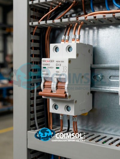 Llave termomagnética bipolar Stronger New Era de 2 x 25A, diseñada para proteger instalaciones eléctricas contra sobrecargas y cortocircuitos. Ideal para tableros eléctricos residenciales y comerciales con montaje en riel DIN. -