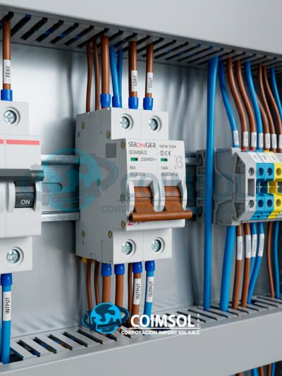 Llave termomagnética bipolar Stronger New Era de 2 x 32A, diseñada para proteger instalaciones eléctricas contra sobrecargas y cortocircuitos. Ideal para tableros eléctricos residenciales y comerciales con montaje en riel DIN. -